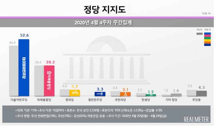 정당 지지도에서는 민주당 지지도가 3주 연속 상승세로 5.8%p 오른 52.6%를 기록해 2018년 6월 셋째주 이후 1년 10개월만에 50%대로 올라섰다. 반면 미래통합당은 0.2%p 내린 28.2%로 4주 연속 30%를 밑돌았다.