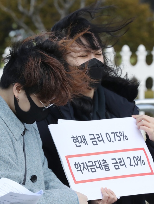 ▲ 반값등록금 운동본부, 전국대학학생회네트워크 등 대학생단체 회원들이 지난 3월 19일 서울 여의도 국회 앞에서 '대학을 바꾸는 3가지 정책 제안' 기자회견을 하고 있다. [뉴시스]