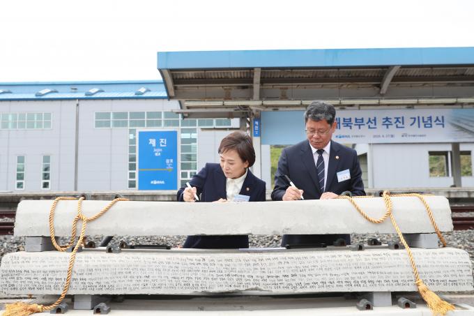 ▲ 김현미 국토부장관과 김연철 통일부장관이 27일 강원 고성군 제진역에서 동해북부선 추진 기념식에 참석한 침목에 서명을 하고 있다. [국토부 제공]