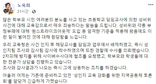 노 교육감은 지난달 30일 자신의 페이스북에 글을 올렸다. 노 교육감은 "많은 학부모들과 시민들의 분노를 사고 있는 교사의 성비위사건에 대해 교육감으로서 죄송하다"면서 "성비위와 각종 부정부패에 대해 원스트라이크아웃제 도입등 엄격한 기준을 적용해 왔음에도 이런 일이 벌어져 참담하다"고 언급했다.