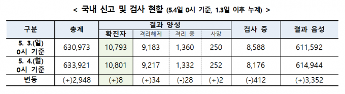 중앙방역대책본부는 4일 0시 기준 코로나19 확진자가 전날 0시보다 8명 늘어 총 1만801명을 기록했다고 밝혔다. 국내 발생 사례는 지난 2일에 이어 이틀 만에 다시 '0명'을 기록한 것이다.