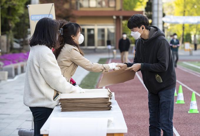 ▲ 2020학년도 첫 대학수학능력시험 모의고사인 3월 전국연합학력평가 실시되는 4월 24일 오전 서울 영등포구 여의도고등학교에서 고등학교 3학년 학생들이 워킹 스루 방식으로 시험지를 배부 받고 있다. [정병혁 기자]