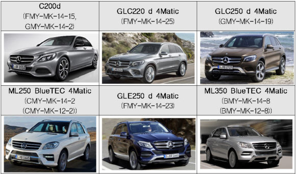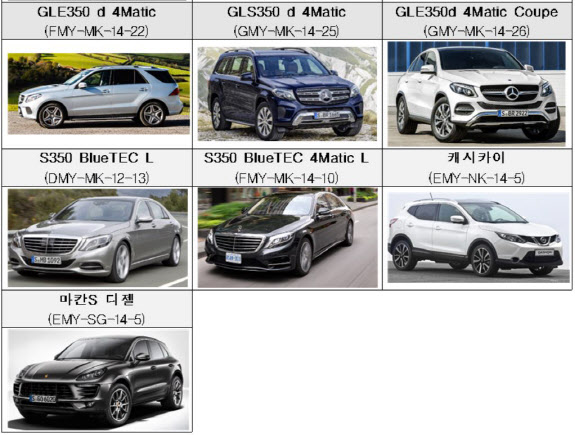 이번에 적발된 차종과 판매량은 벤츠의 경우 △ C200d(배출가스 인증번호에 따라 2종으로 계산) △ GLC220 d 4Matic △ GLC250 d 4Matic △ ML250 BlueTEC 4Matic △ GLE250 d 4Matic △ ML350 BlueTEC 4Matic △ GLE350 d 4Matic △ GLS350 d 4Matic △ GLE350d 4Matic Coupe △ S350 BlueTEC L △ S350 BlueTEC 4Matic L 등 12종 3만7154대다. 닛산은 캐시카이 1종 2293대, 포르쉐는 마칸S 디젤 1종 934대다.
