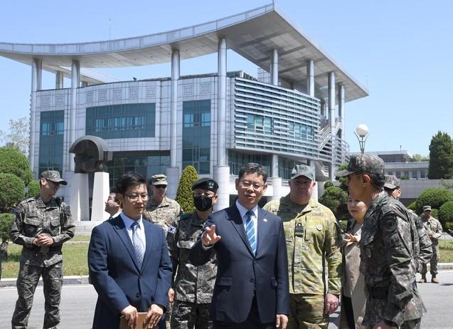 ▲ 김연철 통일부 장관이 6일 경기도 파주시 판문점을 방문해 판문점 견학준비상황 관련 견학코스를 점검하고 있다. [통일부 제공]