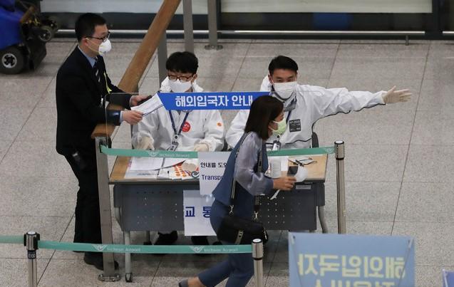 ▲해외에서 입국한 여행객들이 지난달 24일 오후 인천국제공항 제1터미널에서 방호복을 입은 관계자로부터 안내를 받고 있다. [뉴시스]