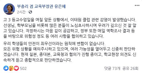 유 부총리는 10일 자신의 페이스북 계정을 통해 "고3 등교수업일을 며칠 앞둔 상황에서 이태원 클럽 관련 감염이 발생했다. 선생님, 학부모님을 비롯해 많은 분들이 노심초사하며 우려가 깊은 것 잘 알고 있다"며 이같이 말했다.