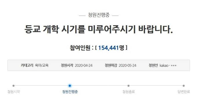 이런 가운데 학부모들 사이에서는 등교 수업을 미루자는 목소리가 커지고 있다. 지난달 24일 청와대 국민청원 게시판에 올라온 '등교개학 시기를 미뤄달라'는 청원에는 이날 오후 9시 현재 약 15만4000여 명이 동의했다. 또한 초등 저학년과 유치원생 등교를 미뤄달라는 청원은 4만6000여 명의 동의를 얻었다.