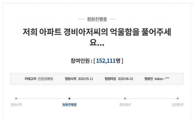 청와대 국민청원 홈페이지에 따르면, 지난 11일 작성된 '저희 아파트 경비아저씨의 억울함을 풀어주세요'라는 제목의 청원글에는 12일 오후 3시 40분 기준 15만 명이 넘는 이들이 동의했다.