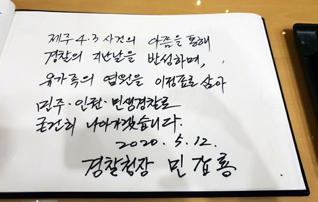 민 청장은 방명록에 "제주4·3사건의 아픔을 통해 경찰의 지난날을 반성하며, 유가족의 염원을 이정표로 삼아 민주·인권·민생 경찰로 굳건히 나아가겠습니다"라고 적었다.