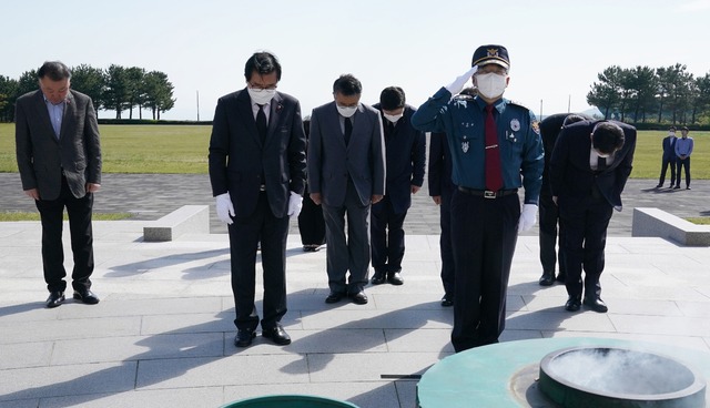 경찰간부 10여 명과 함께 참배를 마친 뒤엔 1만4000여 기의 희생자 위패가 모셔진 위패봉안실에 들렀다. 행방불명인 표석, 유해봉안관, 각명비 등도 둘러봤다.