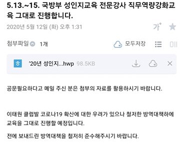 국방부는 이날 전문강사들에게 공지를 통해 "이태원 클럽발 코로나19 확산에 대한 우려가 있으나, 철저한 방역대책 하에 교육을 그대로 진행할 예정"이라고 밝혔다.