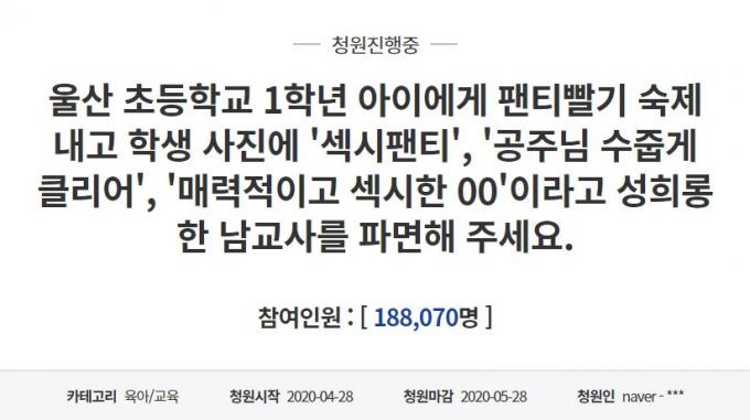 ▲ 울산 초등교사를 파면해달라는 국민청원 참여자가 12일 18만 명을 넘겼다. [청와대 국민청원 게시판 캡처]