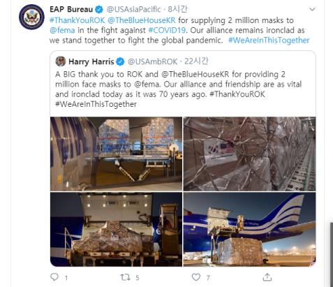이에 미 국무부 동아시아 태평양국(Bureau of East Asian and Pacific Affairs)은 11일(현지시간) 공식 트위터에 "코로나19와 싸움에서 미 연방재난관리청(FEMA)에 마스크 200만장을 제공해줬다"면서 "한국에 감사하다(#ThankYouROK)"는 글을 올렸다.