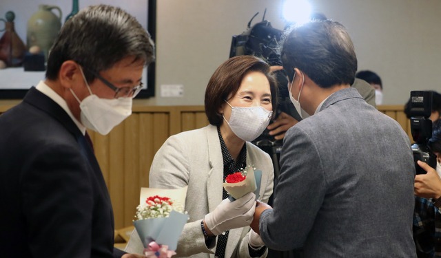 "포스트 코로나19 시대 교육, 계속 함께해 달라" 유은혜 사회부총리 겸 교육부 장관이 스승의 날을 맞아 주요 교원단체 대표들을 만나 카네이션을 선물하며 감사를 표했다.