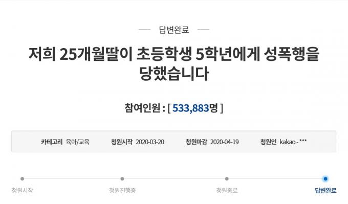 A 씨는 지난 3월 20일 청와대 국민청원 게시판을 통해 '저희 25개월 딸이 초등학교 5학년에게 성폭행을 당했습니다'라는 제목의 청원글을 올려 가해학생과 그 부모에 대한 처벌을 원한다고 주장했다.