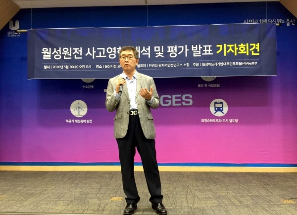 ▲ 한병섭 원자력안전연구소 소장이 20일 오전 11시 울산시청 프레스센터에서 '월성원전 중대사고에 에 따른 해석'을 발표하고 있다. [김잠출 기자]