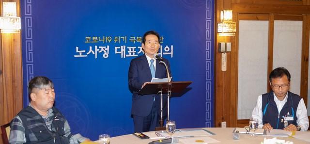 정 총리는 이날 서울공관에서 열린 '코로나19 위기 극복을 위한 노사정 대표자회의'에서 "우리 노동시장에 닥칠 여파가 어느 정도일지 누구도 예측하기 어려운 힘든 상황"이라며 노사정의 노력을 당부했다.