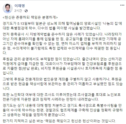 이재명 경기도지사는 20일 자신의 페이스북에 올린 글에서 이 같은 내용을 밝힌 뒤 "나눔의 집이 이를 개선하고 발전하는 계기로 삼아달라"고 당부했다.