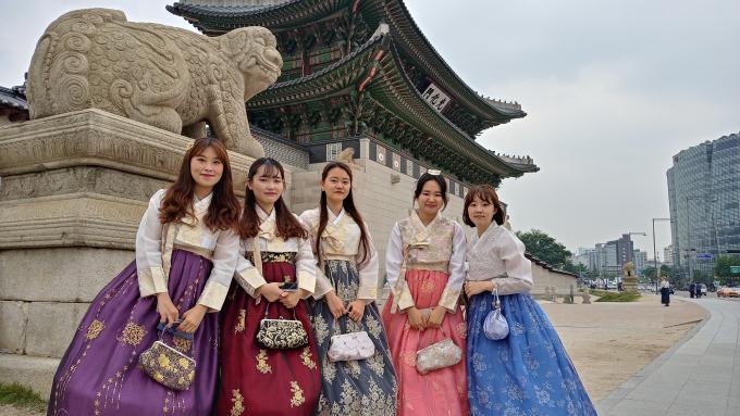 서울 시내 나들이의 필수 코스처럼 여겨졌던 한복 고궁 나들이도 슬슬 기지개를 펴는 모습이다. 반가운 마음에 뉴스에 내보내고 싶다고 하니 흔쾌히 포즈를 취한 대학생들.