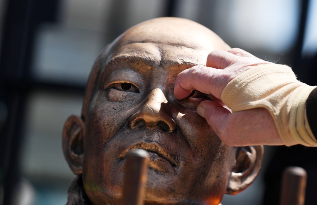 ▲ 사자(死者) 명예훼손' 혐의로 기소된 전두환 씨가 법정에 출석하는 지난달 27일 광주 동구 광주지법 앞에서 오월 어머니회 회원이 무릎 꿇은 전두환 동상의 눈을 파내는 시늉을 하고 있다. [뉴시스]