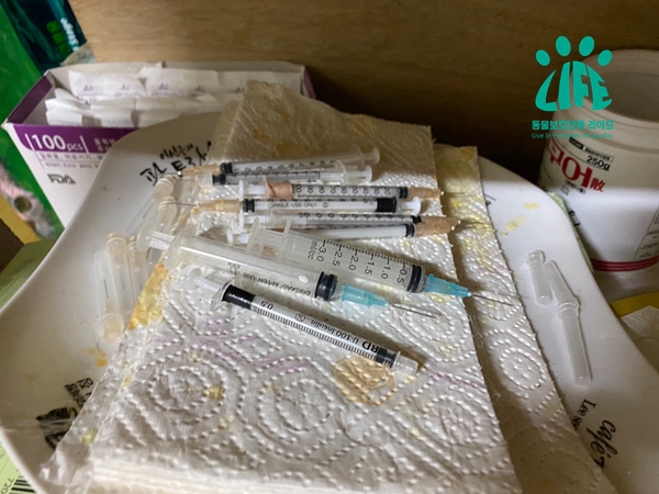 ▲ 불법 번식장에서 발견된 주사기들. [라이프 제공]