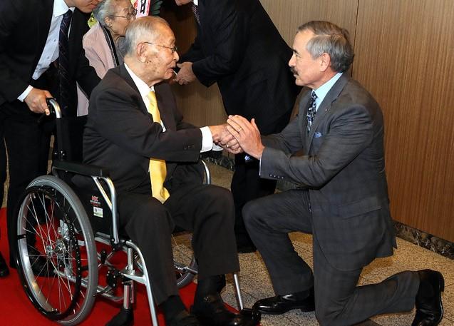 ▲ 주한미군이 주관하는 백선엽 예비역 대장 백수연이 열린 2018년 11월 21일 서울 용산구 국방컨벤션에서 해리 해리스 주한 미국대사가 백 대장 앞에 무릎을 꿇은 채 두손으로 잡으며 인사하고 있다. [뉴시스]