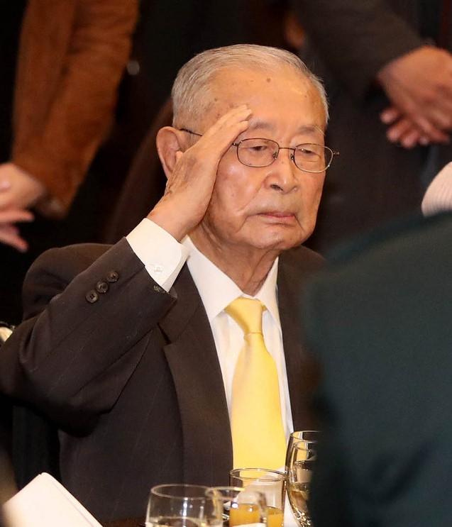 ▲ 2018년 11월 21일 서울  국방컨벤션에서 주한미군 주관으로 열린 백선엽 예비역 대장 생일파티에서 백 장군이 거수경례를 하고 있다. [뉴시스]