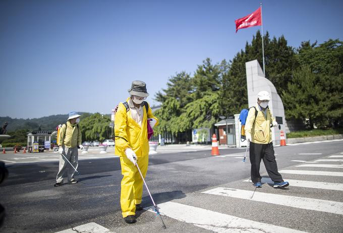 ▲ 지난 29일 오전 서울 동작구 국립서울현충원에서 동작구 방역단이 코로나19 확산 방지를 위한 방역작업을 하고 있다. [정병혁 기자]