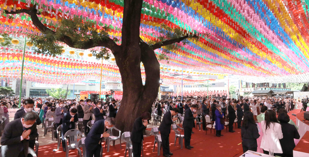 서울 도심 사찰인 조계사에서 열린 기념식에는 1만5000여 인파가 가득했던 예년과 달리 약 1000여 명이 참석했다. 행사 풍경 또한 예년과는 달랐다. 입구에서부터 발열 체크, 손 소독을 받은 후 입장이 가능했고 참석자들은 모두 마스크를 착용했다.