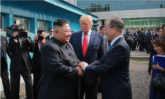 ▲북한 노동신문은 김정은 국무위원장이 지난해 6월 30일 판문점 남측지역에서 문재인 대통령, 도널드 트럼프 미국 대통령과 회동했다고 다음날 보도했다.[노동신문 캡처] 북한의 대남 선전매체 우리민족끼리는 2일 '원인은 다른 데 있지 않다'라는 제목의 기사에서 "지금 북남관계는 교착상태에서 벗어나지 못하고 있다. 그렇다면 그 근본 원인은 어디에 있는가 하는 것이다"라며 이같이 밝혔다.