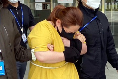 ▲ 의붓아들을 여행용 가방에 가둬 의식불명 상태에 빠트린 혐의로 긴급체포 된 40대 여성이 지난 3일 오후 영장실질심사를 받기 위해 대전지원 천안지원으로 향하고 있다. [뉴시스]