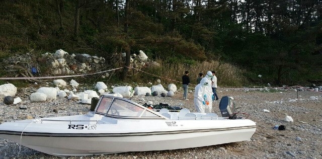▲태안해양경찰서 등 관계자들이 지난달 24일 충남 태안군 소원면 일리포 해변에서 발견된 원인미상의 모터보트를 조사하고 있다. [태안해경 제공]