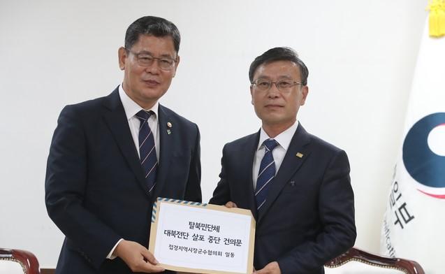 경기도 김포 등 접경 지역 10개 지자체 시장과 군수들이 '대북전단' 살포 규제를 촉구하는 건의문을 통일부에 제출했다.
