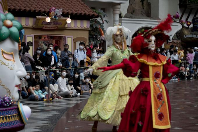 ▲ 어린이날인 지난 5월 5일 서울 송파구 잠실 롯데월드를 찾은 아이들과 부모들이 마스크를 쓴 채 퍼레이드를 보고 있다. [문재원 기자]