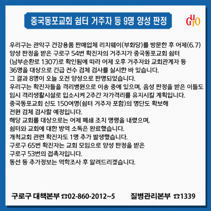 구로구는 8일 "관내 54번째 확진자의 거주지가 중국동포교회 쉼터로 확인됨에 따라 거주자와 교회 관계자 등 36명을 대상으로 긴급 전수 검체 검사를 실시해 이날 오전 8명이 추가 양성 판정을 받았다"고 밝혔다.