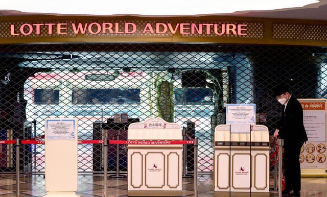 ▲ 지난 8일 오전 서울 송파구 롯데월드 입구가 폐쇄돼 있다. 롯데월드 측은 방역당국으로부터 확진자가 방문했다는 안내를 받고 이날 방역을 진행했다. [뉴시스]