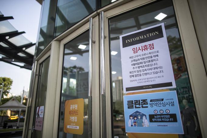 ▲ 매장에서 근무하는 직원이 코로나19 확진 판정을 받은 경기 부천 뉴코아 아울렛 부천점 출입문에 지난 9일 임시휴점 안내문이 붙어 있다. [정병혁 기자]
