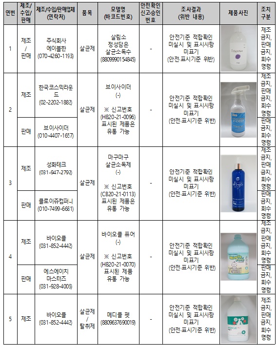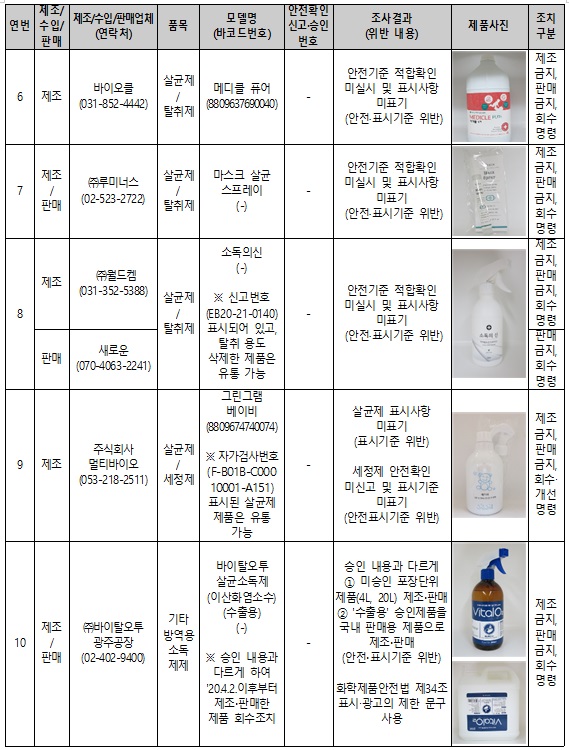 이번에 적발된 제품은 △ 살림소 정성담은 살균소독수 △ 브이사이더 △마구마구 살균소독제 △ 바이오클 퓨어 △ 메디클 펫 △ 메디클 퓨어 △ 마스크 살균 스프레이 △ 소독의신 △ 그린그램 베이비 △ 바이탈오투 살균소독제 등이다.