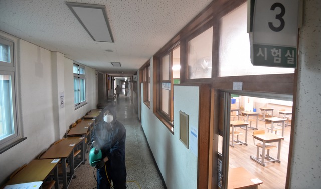 ▲ 12일 오후 지방공무원 시험장인 경기 수원 권선구 구운중학교에서 방역업체 관계자가 방역 작업을 하고 있다. [뉴시스]