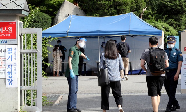 방역당국은 철저한 대책을 마련했다. 우선 마스크와 고무장갑, 안면보호구를 착용한 요원들이 고사장 건물 밖에서 수험생의 체온을 체크했다. 마스크 착용과 코로나19 유증상 여부도 같이 확인했다. 수험생들은 바닥에 표시된 1.5m 간격을 유지한 채 차례대로 검사를 받았다.