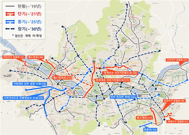 공사가 완료되면 도심과 한강을 중심으로 서울을 남-북(광화문~한강대로~한강대교~여의도)과 동-서(청계천~성북천·정릉천·중랑천·한강)로 연결하는 자전거 간선망이 완성된다.