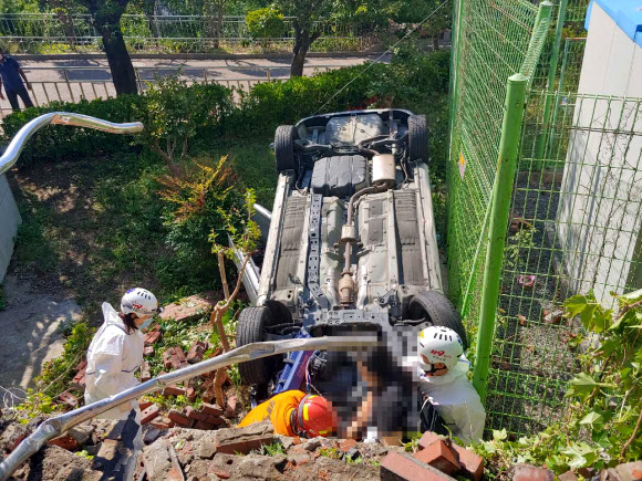 ▲ 15일 오후 3시 32분께 부산 해운대구의 한 초등학교 앞 스쿨존 내에서 산타페 차량이 중앙선을 넘어 좌회전하다 직진하던 아반떼 승용차와 충돌했다. 사진은 충돌 후 인근 담장을 들이 받은 뒤 전복된 아반떼 차량 모습. [부산지방경찰청 제공]