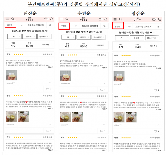 공정위에 따르면 온라인 쇼핑몰 '임블리'를 운영하는 부건에프엔씨는 상품평이 좋은 후기만 게시판의 상단에 위치시키고 불만이 담긴 후기는 하단으로 내렸다. 또 '베스트 아이템'이라는 메뉴에서 판매금액 등 객관적 기준이 아닌 자체 브랜드, 재고량 등에 따라 게시 순위를 선정하기도 했다. '베스트 아이템' 메뉴에서 보이는 32개 상품 가운데 판매 순위가 50위 밖인 상품도 섞여 있었다.