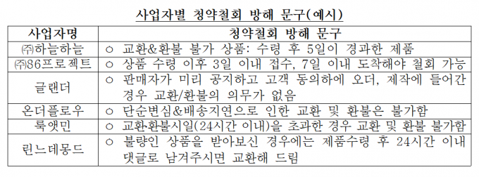 교환·환불 기간을 임의로 짧게 정해 반품이 어렵게 만든 곳도 있었다. 사업자 하늘하늘은 '5일이 지난 상품은 교환·환불이 어렵다'고 고지했으며 그 외의 5개 사업자는 '판매자가 미리 공지하고 제작한 경우에는 교환 의무가 없다'고 하거나 '제품수령 후 24시간 이내 댓글로 남겨야'하는 조건 등을 제시했다.
