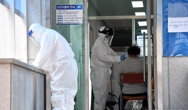 ▲ 부산 동래구보건소 선별진료소에서 한 시민이 코로나19 진단검사를 받기 위해 체온측정을 하고 있다. [뉴시스]