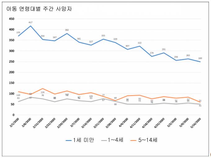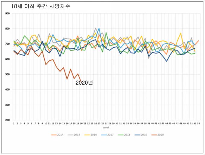 이 논문에 따르면 18세 이하의 미 전역 주간 사망자 숫자는 700명 대를 유지하다가 미국의 록다운이 본격화된 3월 초부터 급격하게 떨어진다. 주간 사망자 숫자는 4월 중순에는 500명 이하로 떨어졌다. 평년보다 30%의 어린이들이 덜 죽은 것이다. 18세 이하 사망자 감소의 대부분은 1살 이하 영아들의 사망자 감소에서 비롯됐다. 영아사망 원인의 30%를 차지하는 돌연사가 현저하게 줄어들었기 때문이다.