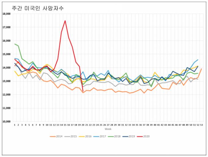 "백신이 돌연사 원인 의심 증폭 시켜" 미국은 세계 최대의 코로나19 감염국이다. 23일(현지시간) 현재 확진자는 234만 명을 넘어섰고, 사망자는 12만 1157명이다. 예년과 비교할 때 대부분 연령층에서 사망자가 늘었고, 특히 고령층에서는 평년 사망자 숫자보다 훨씬 늘었다.