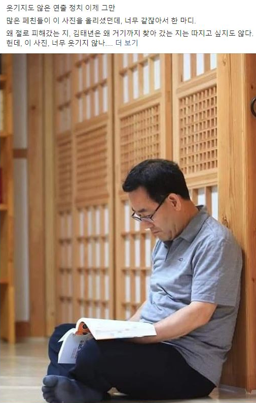 이밖에도 "누구는 땡볕 더위에서 쌔빠지게 일해야 먹고 사는데 국회의원들은 시원한 곳에서 책을 보고 있어도 돈 받는다" "국회의원들은 시도때도 없이 휴가가나" "진정성과 능력 있는 사람은 저런 쇼 하면서 정치 안 한다. 너무 티난다" 등 비난이 달렸다.