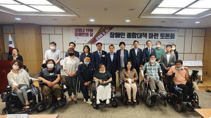 ▲ '코로나19와 장애인의 삶'을 주제로 감염병 및 재난 상황에서 장애인을 위한 종합적인 대책 마련을 위해 지난 23일 국회의원회관 제3세미나실에서 열린 토론회에서 참가자들이 기념사진을 찍고 있다. [김지원 기자]