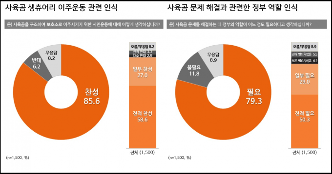 동물자유연대는 시민들의 인식을 파악하기 위해 여론조사기관 한국갤럽에 의뢰해 지난해 8월 1일부터 5일까지 전국 성인 1500명에게 그 의견을 물었다. 그 결과 "사육곰을 구조해 보호소로 이주시키기 위한 시민운동에 대해 어떻게 생각하십니까"에 대한 질문에 찬성이 85.6%를 차지했다. "사육곰 문제 해결과 관련한 정부의 역할이 필요하다고 생각하십니까?"에 대한 질문에는 79.3%가 필요하다고 답했다.